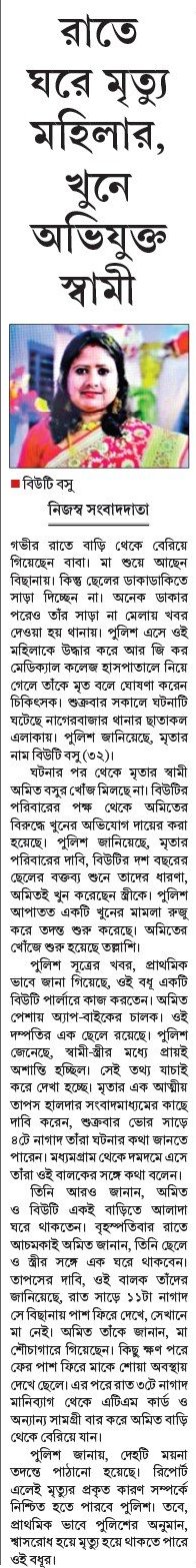ঘটনার পর থেকে মৃতার স্বামী অমিত বসুর খোঁজ মিলছে না। বিউটির পরিবারের পক্ষ থেকে অমিতের বিরুদ্ধে খুনের অভিযোগ দায়ের করা হয়েছে। পুলিশ জানিয়েছে, মৃতার পরিবারের দাবি, বিউটির দশ বছরের ছেলের বক্তব্য শুনে তাদের ধারণা, অমিতই খুন করেছেন স্ত্রীকে। পুলিশ আপাতত একটি খুনের মামলা রুজু করে তদন্ত শুরু করেছে। অমিতের খোঁজে শুরু হয়েছে তল্লাশি।