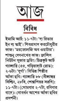 ইমামি আর্ট: ১১-৭টা। ‘দ্য রিভার ইন দ্য স্কাই’। শিবপ্রসাদ করচৌধুরীর কাজ। ‘মরফোলজি অব ওয়াটার’। শান্তনু দেবনাথের কাজ। ফ্রান্সিস নিউটন সুজার ড্রয়িং। চিত্রকূট আর্ট গ্যালারি (৫৫, গড়িয়াহাট রোড): ২-৬টা। ‘দুর্গা’। বিভিন্ন শিল্পীর আঁকা ছবি। গ্যালারি ৮৮ (নীলাম্বর বিল্ডিং, ২৮বি, শেক্সপিয়র সরণি): ১১-৭টা। (সোমবার ২-৭টা, রবিবার বাদে)। গোবর্ধন আশের আঁকা ছবির প্রদর্শনী।
