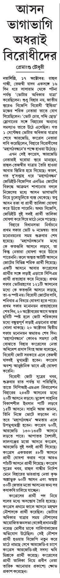 বিরোধী জোট সূত্রের খবর, শুক্রবার রাত পর্যন্ত যা পরিস্থিতি, তাতে সিপিআই-এমএল লিবারেশন বিহারের ২৪৩টি আসনের মধ্যে ২০টি আসনে লড়বে। মুকেশ সাহনির বিকাশশীল ইনসান পার্টি লড়বে ১৫টি আসনে। সাহনি আজ জানান, তিনি নিজে ভোটে লড়বেন না। তবে ‘মহাগঠবন্ধন’ ক্ষমতায় এলে উপমুখ্যমন্ত্রী হবেন। কংগ্রেস ৬০টি, আরজেডি ১৩০-১৩৫টি আসনে লড়তে পারে। আপাতত বৈশালী, লালগঞ্জের মতো আসনে কংগ্রেস, আরজেডি দুই দলই প্রার্থী দিয়েছে। কংগ্রেস একতরফা ৪৮টি আসনে প্রার্থী ঘোষণা করার পরে আরও পাঁচটি আসনে প্রার্থী দিয়েছে। কংগ্রেস সূত্রের খবর, রাহুল গান্ধীর নির্দেশ মেনে বিহারের ভারপ্রাপ্ত নেতা কৃষ্ণ অল্লাভুরু ৬০টি আসন এবং অন্তত ৩০টি জেতার মতো আসনের জন্য দর কষাকষি চালিয়ে যাচ্ছেন।