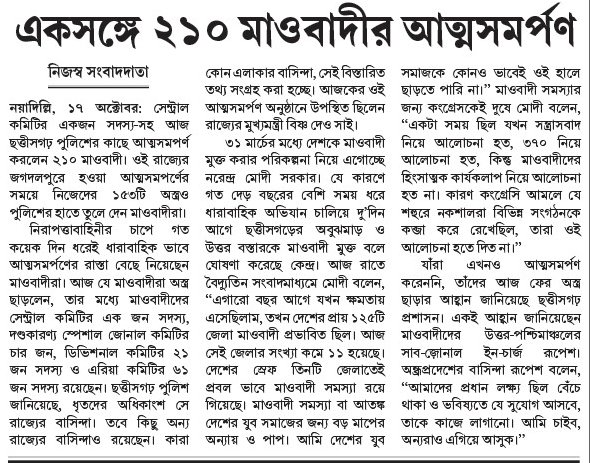৩১ মার্চের মধ্যে দেশকে মাওবাদী মুক্ত করার পরিকল্পনা নিয়ে এগোচ্ছে নরেন্দ্র মোদী সরকার। যে কারণে গত দেড় বছরের বেশি সময় ধরে ধারাবাহিক অভিযান চালিয়ে দু’দিন আগে ছত্তীসগড়ের অবুঝমাড় ও উত্তর বস্তারকে মাওবাদী মুক্ত বলে ঘোষণা করেছে কেন্দ্র। আজ রাতে বৈদ্যুতিন সংবাদমাধ্যমে মোদী বলেন, ‘‘এগারো বছর আগে যখন ক্ষমতায় এসেছিলাম, তখন দেশের প্রায় ১২৫টি জেলা মাওবাদী প্রভাবিত ছিল। আজ সেই জেলার সংখ্যা কমে ১১ হয়েছে। দেশের স্রেফ তিনটি জেলাতেই প্রবল ভাবে মাওবাদী সমস্যা রয়ে গিয়েছে। মাওবাদী সমস্যা বা আতঙ্ক দেশের যুব সমাজের জন্য বড় মাপের অন্যায় ও পাপ। আমি দেশের যুব সমাজকে কোনও ভাবেই ওই হালে ছাড়তে পারি না।’’ মাওবাদী সমস্যার জন্য কংগ্রেসকেই দুষে মোদী বলেন, ‘‘একটা সময় ছিল যখন সন্ত্রাসবাদ নিয়ে আলোচনা হত, ৩৭০ নিয়ে আলোচনা হত, কিন্তু মাওবাদীদের হিংসাত্মক কার্যকলাপ নিয়ে আলোচনা হত না। কারণ কংগ্রেসি আমলে যে শহুরে নকশালরা বিভিন্ন সংগঠনকে কব্জা করে রেখেছিল, তারা ওই আলোচনা হতে দিত না।’’