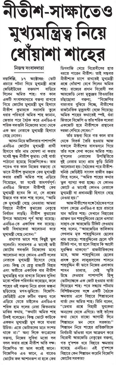 নয়াদিল্লি, ১৭ অক্টোবর: ভোট প্রচারে পটনা গিয়ে মুখ্যমন্ত্রী প্রশ্নে জেডিইউয়ের রক্তচাপ বাড়িয়ে দিলেন অমিত শাহ। গত কাল একটি সংবাদমাধ্যমে বক্তব্য রাখতে গিয়ে জোটের মুখ্যমন্ত্রী মুখ হিসাবে নীতীশ কুমারকে সরাসরি তুলে ধরার পরিবর্তে অমিত শাহ জানান, জেতার পরে বৈঠক করে এনডিএ-র শরিক দলগুলি নিজেদের মধ্যে থেকে এক জন নেতাকে মুখ্যমন্ত্রী হিসাবে