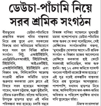 ডেউচা-পাঁচামি নিয়ে সরব শ্রমিক সংগঠন