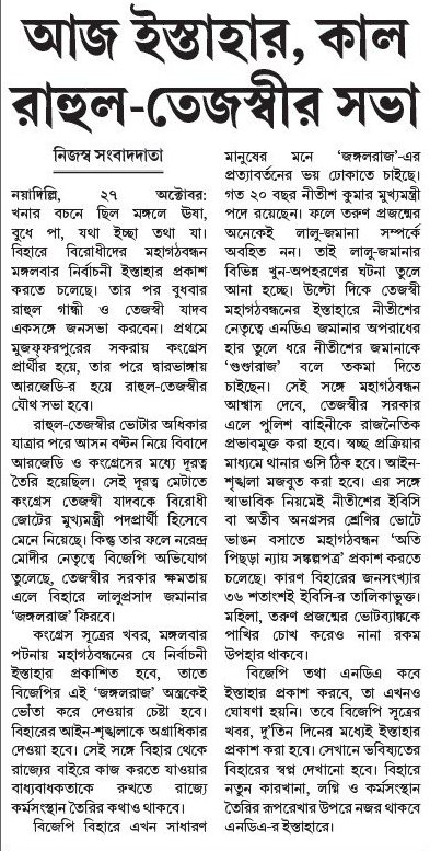 কংগ্রেস সূত্রের খবর, মঙ্গলবার পটনায় মহাগঠবন্ধনের যে নির্বাচনী ইস্তাহার প্রকাশিত হবে, তাতে বিজেপির এই ‘জঙ্গলরাজ’ অস্ত্রকেই ভোঁতা করে দেওয়ার চেষ্টা হবে। বিহারের আইন-শৃঙ্খলাকে অগ্রাধিকার দেওয়া হবে। সেই সঙ্গে বিহার থেকে রাজ্যের বাইরে কাজ করতে যাওয়ার বাধ্যবাধকতাকে রুখতে রাজ্যে কর্মসংস্থান তৈরির কথাও থাকবে।