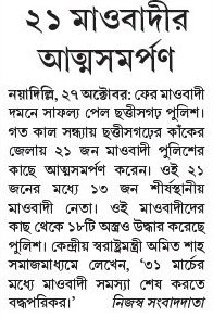 নয়াদিল্লি, ২৭ অক্টোবর: ফের মাওবাদী দমনে সাফল্য পেল ছত্তীসগঢ় পুলিশ। গত কাল সন্ধ্যায় ছত্তীসগঢ়ের কাঁকের জেলায় ২১ জন মাওবাদী পুলিশের কাছে আত্মসমর্পণ করেন। ওই ২১ জনের মধ্যে ১৩ জন শীর্ষস্থানীয় মাওবাদী নেতা। ওই মাওবাদীদের কাছ থেকে ১৮টি অস্ত্রও উদ্ধার করেছে পুলিশ। কেন্দ্রীয় স্বরাষ্ট্রমন্ত্রী অমিত শাহ সমাজমাধ্যমে লেখেন, ‘৩১ মার্চের মধ্যে মাওবাদী সমস্যা শেষ করতে বদ্ধপরিকর।’ নিজস্ব সংবাদদাতা