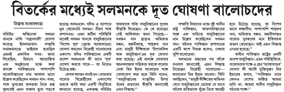 গিয়েছিল, রিয়াধে আয়োজিত এক অনুষ্ঠানের মঞ্চে কথা প্রসঙ্গে পাকিস্তানের পাশাপাশি বালোচিস্তানের নাম আলাদা ভাবে উল্লেখ করেছিলেন সলমন খান। খবর, পাক ভূখণ্ডের অখণ্ডতা নিয়ে প্রশ্ন তুলতেই এমন সাজার মুখে পড়তে হয়েছে সলমনকে। যদিও এ ব্যাপারে মুখ খোলেননি সলমন। নীরব পাক প্রশাসনও। এমন জটিল পরিস্থিতি মাঝেই সলমন খানকে বালুচিস্তানের ‘বিশেষ দূত’ (ব্র্যান্ড অ্যাম্বাসাডর) ঘোষণা করলেন বিদ্রোহী বালোচদের একাংশ। যদিও পাকিস্তানের একটি প্রদেশ সলমনকে কী ভাবে ‘দূত’ ঘোষণা করতে পারে— তা নিয়েও উঠেছে প্রশ্ন।