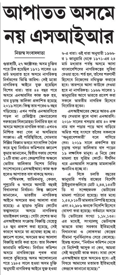 পশ্চিমবঙ্গ, তামিলনাড়ু, কেরল, পুদুচেরি ও অসমে আগামী বছরই বিধানসভা নির্বাচন। কিন্তু জ্ঞানেশ জানালেন, ভারতীয় নাগরিকত্ব আইনে অসমের জন্য আলাদা ধারা রয়েছে। এ ছাড়াও সুপ্রিম কোর্টের তত্ত্বাবধানে অসমে নাগরিকত্ব যাচাইকরণ চলছে। গোটা দেশের জন্য এসআইআর সংক্রান্ত বিজ্ঞপ্তি যেহেতু ২৪ জুন প্রকাশ করা হয়েছে, সেই কারণে অসমে তা প্রযোজ্য হচ্ছে না। জ্ঞানেশ বলেন, অসমের জন্য আলাদা বিজ্ঞপ্তি জারি করা হবে। তার দিনক্ষণ জানায়নি কমিশন। নির্বাচন কমিশন অসমে নাগরিকত্বের পৃথক ধারা বলতে বুঝিয়েছে অসম আন্দোলনের পরে ১৯৮৫ সালে হওয়া অসম চুক্তি অনুযায়ী নাগরিকত্ব আইনে যুক্ত হওয়া ৬-এ ধারা। ওই ধারা অনুযায়ী ১৯৬৬-র ১ জানুয়ারি থেকে ১৯৭১-এর ২৪ মার্চ মধ্যরাত পর্যন্ত অসমে আসা বাংলাদেশিদের নাগরিকত্বের সুবিধা দেওয়া হবে। শর্ত হল, তাঁদের শরণার্থী হিসেবে নিজেদের নথিভুক্ত করাতে হবে। তারপরে আসা কাউকে দেওয়া হবে না নাগরিকত্ব। ১৯৬৬ সালের ১ জানুয়ারির আগে ভারতে প্রবেশ করা সকলে ভারতীয় নাগরিক হিসেবে বিবেচিত হবেন।