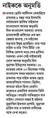 }} ঢাকায় হোলি আর্টিসান বেকারিতে হামলার ৯ বছর পরে ইসলামি ধর্মপ্রচারক জ়াকির নাইককে বাংলাদেশে আসার অনুমতি দিল বাংলাদেশ সরকার। ঢাকায় হামলাকারী জঙ্গিদের এক জন জেরায় জানায়, সে নাইকের বক্তৃতায় উদ্বুদ্ধ হয়েছিল। তার পরে নাইক ও তাঁর ‘পিস টিভি’-কে নিষিদ্ধ ঘোষণা করে শেখ হাসিনা সরকার। এখন সেই নাইককেই দেশে আসার অনুমতি দিল মূহাম্মদ ইউনূসের সরকার। ২৮ নভেম্বর থেকে ২০ ডিসেম্বর পর্যন্ত বাংলাদেশ সফর করবেন। ঢাকায় হামলার পরে নাইক ভারত ছেড়ে মালয়েশিয়ায় পালান। ব্রিটেন, কানাডা তাঁকে ভিসা দেয়নি। ভারতেও একাধিক মামলায় তিনি অভিযুক্ত। সম্প্রতি পাকিস্তানে যান নাইক। সেখানে লস্কর ই তইবার মুজ়াম্মিল ইকবাল হাশমি, মুহাম্মদ হারিস ধার ও ফয়সল নাদিমের সঙ্গে দেখা করেন।