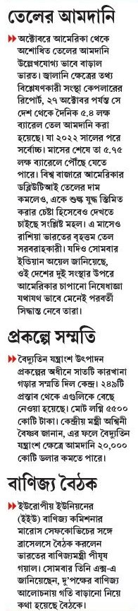 }} অক্টোবরে আমেরিকা থেকে অশোধিত তেলের আমদানি উল্লেখযোগ্য ভাবে বাড়াল ভারত। জ্বালানি ক্ষেত্রের তথ্য বিশ্লেষণকারী সংস্থা কেপলারের রিপোর্ট, ২৭ অক্টোবর পর্যন্ত সে দেশ থেকে দৈনিক ৫.৪ লক্ষ ব্যারেল তেল আমদানি করা হয়েছে। যা ২০২২ সালের পরে সর্বোচ্চ। মাসের শেষে তা ৫.৭৫ লক্ষ ব্যারেলে পৌঁছে যেতে পারে। বিশ্ব বাজারে আমেরিকার ডব্লিউটিআই তেলের দাম কমলেও, একে শুল্ক যুদ্ধ স্তিমিত করার চেষ্টা হিসেবেও দেখতে চাইছে সংশ্লিষ্ট মহল। এ মাসেও রাশিয়া ভারতের বৃহত্তম তেল সরবরাহকারী। যদিও সোমবার ইন্ডিয়ান অয়েল জানিয়েছে, ওই দেশের দুই সংস্থার উপরে আমেরিকার চাপানো নিষেধাজ্ঞা যথাযথ ভাবে মেনেই পরবর্তী সিদ্ধান্ত নেবে তারা।