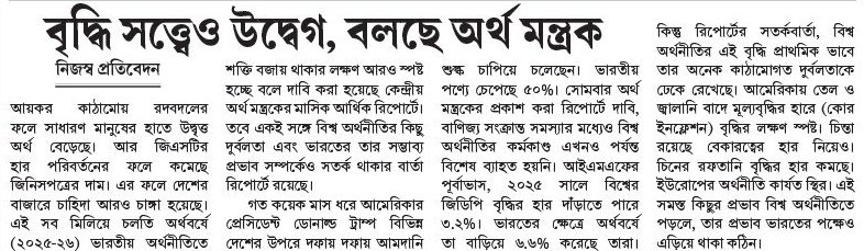 আয়কর কাঠামোয় রদবদলের ফলে সাধারণ মানুষের হাতে উদ্বৃত্ত অর্থ বেড়েছে। আর জিএসটির হার পরিবর্তনের ফলে কমেছে জিনিসপত্রের দাম। এর ফলে দেশের বাজারে চাহিদা আরও চাঙ্গা হয়েছে। এই সব মিলিয়ে চলতি অর্থবর্ষে (২০২৫-২৬) ভারতীয় অর্থনীতিতে শক্তি বজায় থাকার লক্ষণ আরও স্পষ্ট হচ্ছে বলে দাবি করা হয়েছে কেন্দ্রীয় অর্থ মন্ত্রকের মাসিক আর্থিক রিপোর্টে। তবে একই সঙ্গে বিশ্ব অর্থনীতির কিছু দুর্বলতা এবং ভারতের তার সম্ভাব্য প্রভাব সম্পর্কেও সতর্ক থাকার বার্তা রিপোর্টে রয়েছে।