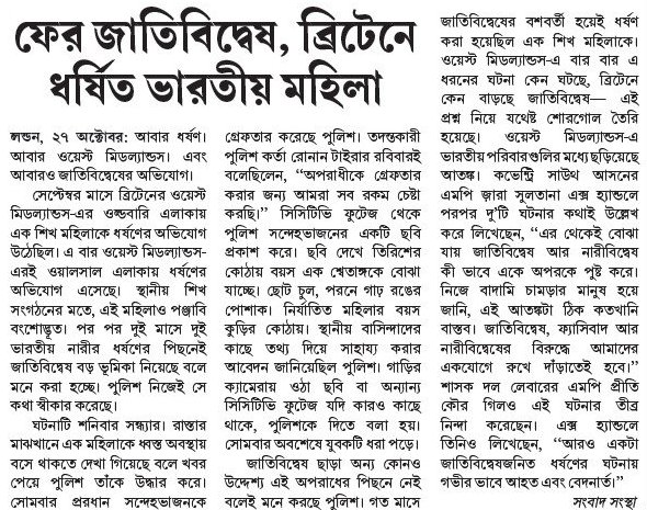 সেপ্টেম্বর মাসে ব্রিটেনের ওয়েস্ট মিডল্যান্ডস-এর ওল্ডবারি এলাকায় এক শিখ মহিলাকে ধর্ষণের অভিযোগ উঠেছিল। এ বার ওয়েস্ট মিডল্যান্ডস-এরই ওয়ালসাল এলাকায় ধর্ষণের অভিযোগ এসেছে। স্থানীয় শিখ সংগঠনের মতে, এই মহিলাও পঞ্জাবি বংশোদ্ভূত। পর পর দুই মাসে দুই ভারতীয় নারীর ধর্ষণের পিছনেই জাতিবিদ্বেষ বড় ভূমিকা নিয়েছে বলে মনে করা হচ্ছে। পুলিশ নিজেই সে কথা স্বীকার করেছে।